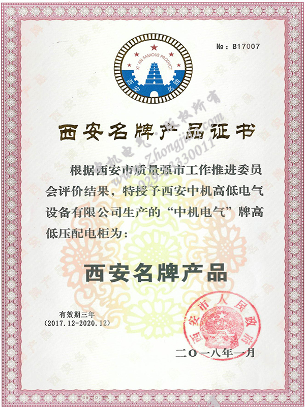 西安名牌產(chǎn)品證書