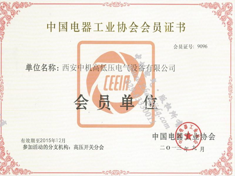 中國電器工業(yè)協(xié)會會員榮譽證書