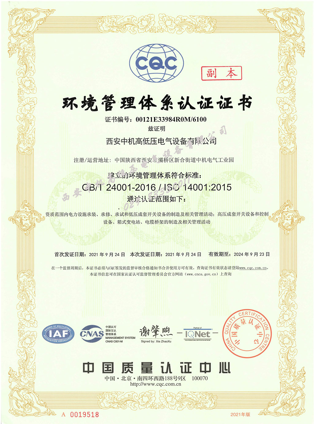 環境管理體系證書14001
